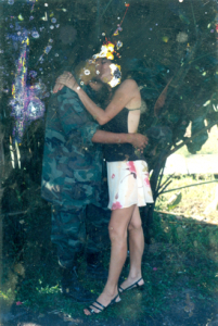 La mujer abraza al militar, que le corresponde por la cintura. Su posición es la de entrega al momento.